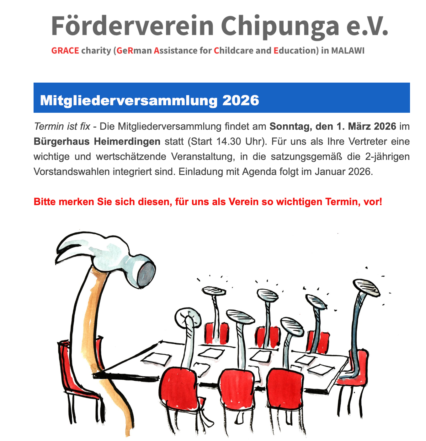 Chipunga 8. August 2025 - Die deutschte Botschafterin in Malawi Frau Ute König hat Chipunga persönlich besucht. Unser Südpartner vom CCYRD und Vertreter der Gemeinde haben unsere Hilfsmaßnahmen und deren Auswirkungen mit ihr diskutiert. Das Interesse der Botschafterin wurde durch das persönliche Kennenlernen an den Feierlichkeiten zum Tag der Deutschen Einheit 2024 geweckt. Zudem hat das CCYRD im Rahmen des Kleinstmittel-Projekte-Fonds der Botschaft einen Antrag zur Beteiligung an den Kosten für einen neuen Kindergarten gestellt. Hoffen wir, dass der persönlicher Besuch die Arbeit in Chipunga sichtbar gemacht und die Chance des Kindergartenneubaus verbessert hat.